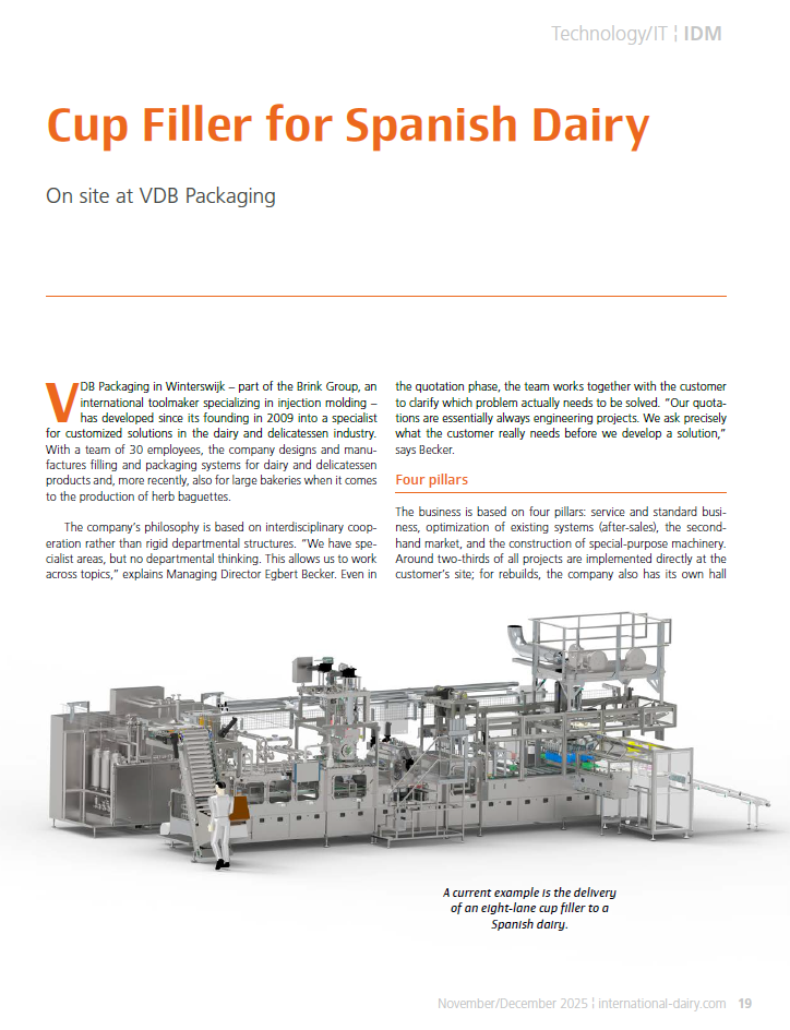 Seit August 2009 sind wir – VDB Packaging – am Markt und als Dienstleister für Sie da. Wir gehören der Brink Gruppe an und an unserem Standort in Winterswijk, nahe der deutschen Grenze, sind wir direkter Nachbar zu unserer Schwesterfirma Brink Moulds mit dem Schwerpunkt „Werkzeugbau“. Mit der Präzision des Werkzeugbaues werden so nahezu alle mechanischen Bauteile im eigenen Hause gefertigt. Dieses spart Zeit und reduziert die Kosten.